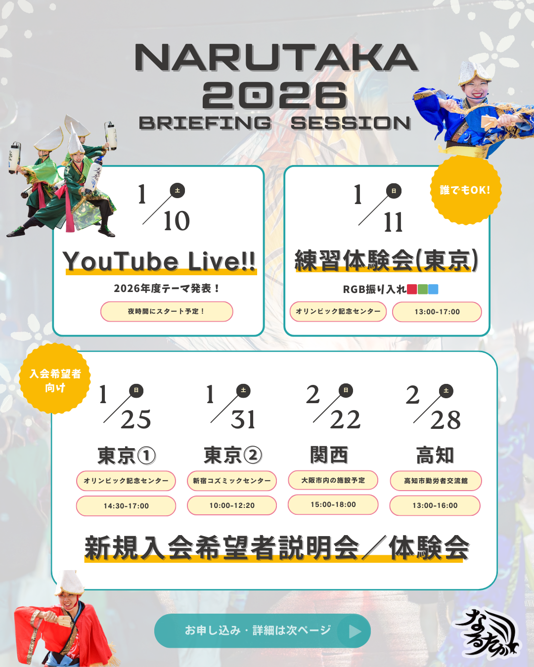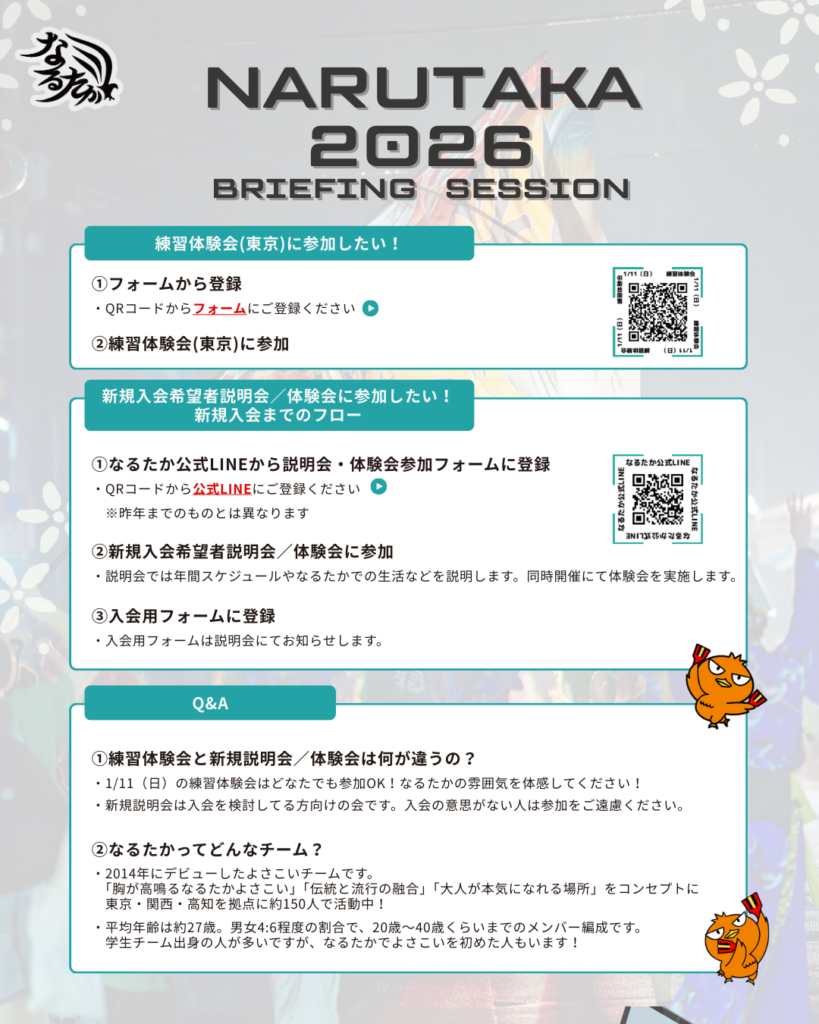 毎年8月に開催される高知のよさこい祭りをはじめ、2027年3月迄(予定)のなるたかの活動に参加いただく新規メンバーを募集します。